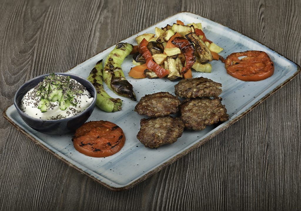 Izgara Köfte, Izgara Domates, Airfryer ile Hazırlanmış Sebzeler, Chialı Yoğurt