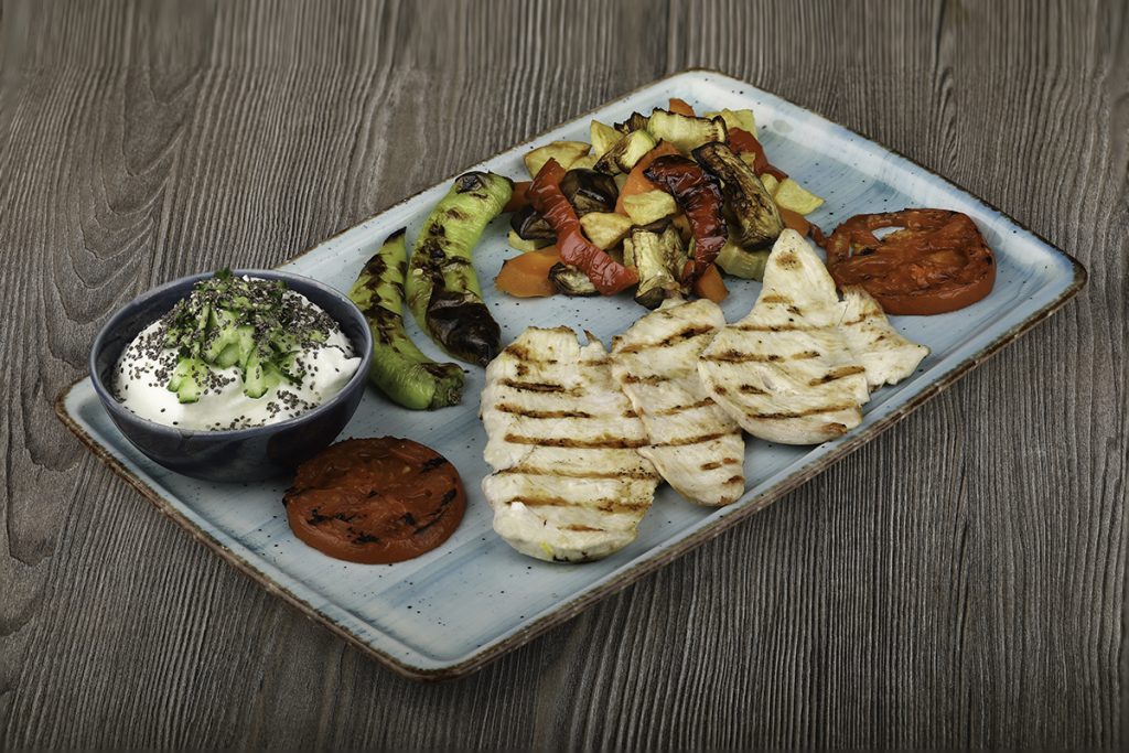 Izgara Köfte, Izgara Tavuk, Izgara Domates, Airfryer ile Hazırlanmış Sebzeler, Chialı Yoğurt